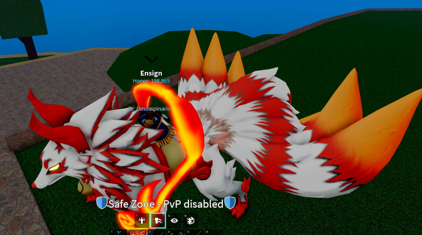 3 Tails: The user gets three glowing orbs floating around them, and when using the [F] move or an M1 attack, the enemy will deal tick damage by red flames. The DoT effect lasts for 3 seconds, dealing 1 tick of damage every second. Fourth [M1] gets a slightly different visual. First 3 M1s gain extended reach represented by three flaming slashes that are thrown foward, this is exclusive of the Empyrean Kitsune.