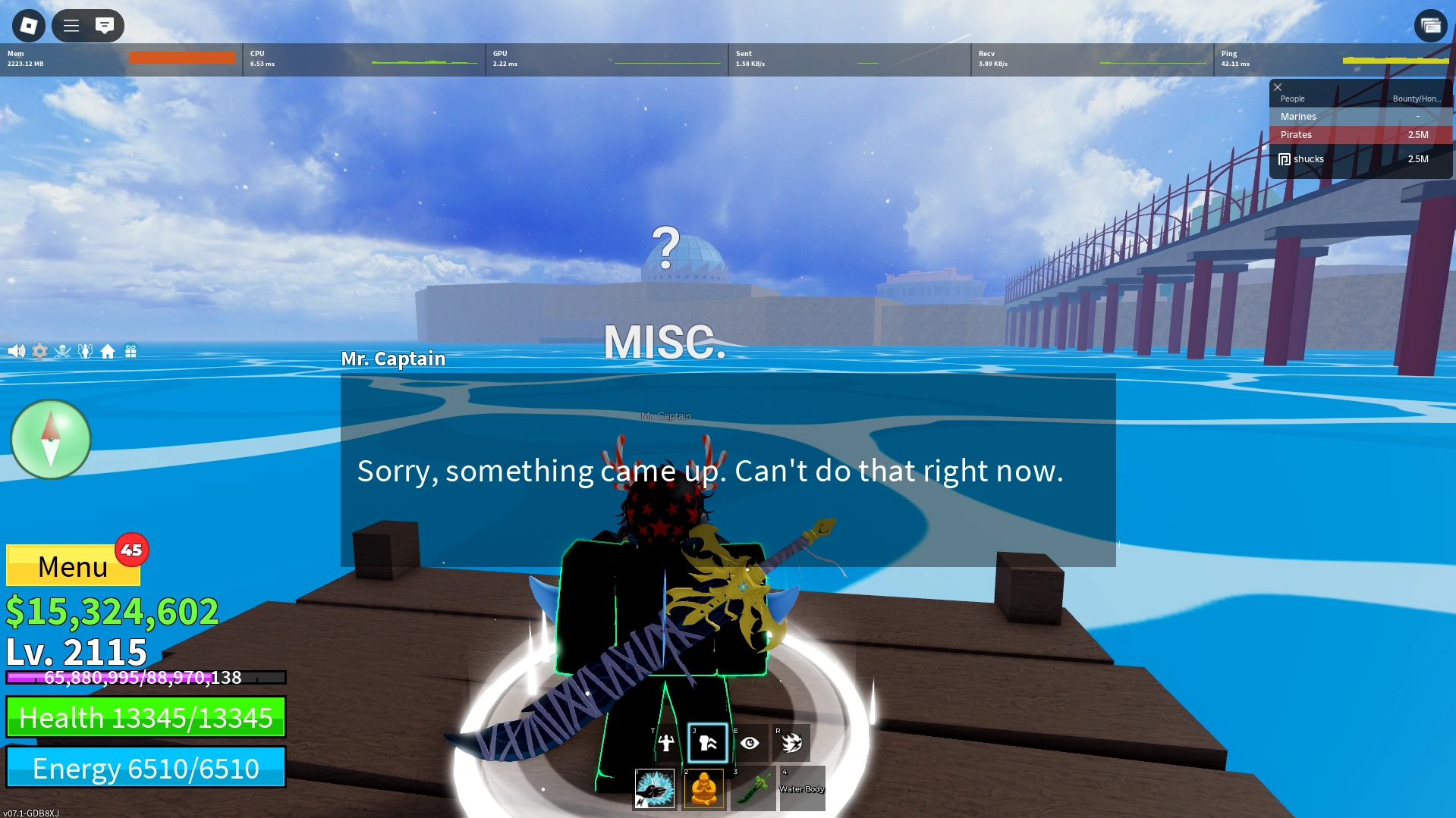 - Mr. Captain will not teleport the player to the Third Sea while in Combat.